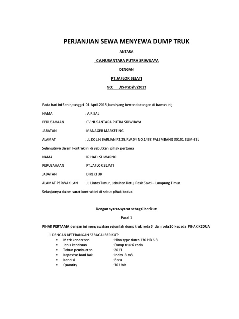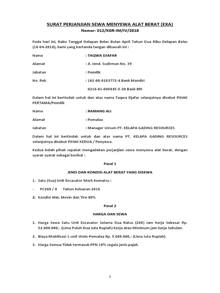 Contoh Kontrak from img.dokumen.tips Contoh surat perjanjian rental menyewa alat. No spesifikasi jenis alat berat harga sewa alat perjam jumlah 1. Jam kerja, dengan perhitungan pemakaian maksimal untuk 1 hari sebanyak 8 (delapan) jam kerja, dengan perhitungan pemakaian minimal sebanyak 50 (lima puluh) jam kerja atau 7 hari kerja, mana yang tercapai duluan. 7 contoh surat perjanjian sewa menyewa rumah mobil peralatan doc. Usaha penyewaan alat berat kami didukung dengan alat alat berat yang handal dan sumberdaya manusia yang berpengalaman dan profesional. Namun sisi positifnya, kontraktor tidak lagi dipusingkan dengan kontrak penyewaan dan sewa per bulan. Komatsu pc 200 wheel loader rp. Download surat perjanjian sewa alat berat di bandung dan jakarta telp :